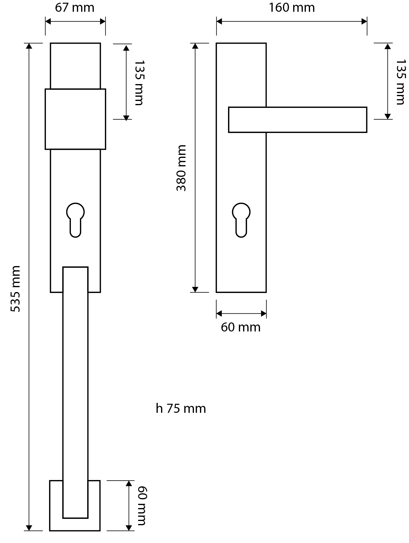 Eingangstürenset: Türklinke (re o. li) + Haustürknauf und Bügelgriff mit Schild art.1055 - Linea Calì